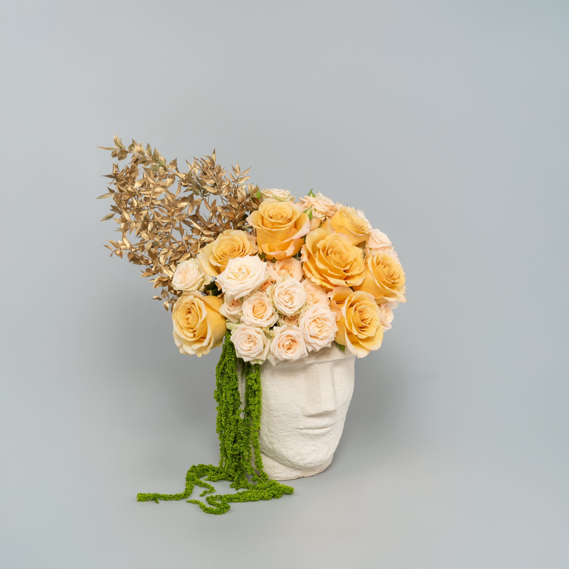 Warm yellow and cream roses paired with cascading green amaranthus and golden foliage, arranged in a sculptural face vase. A bold fusion of art, nature, and luxury design.