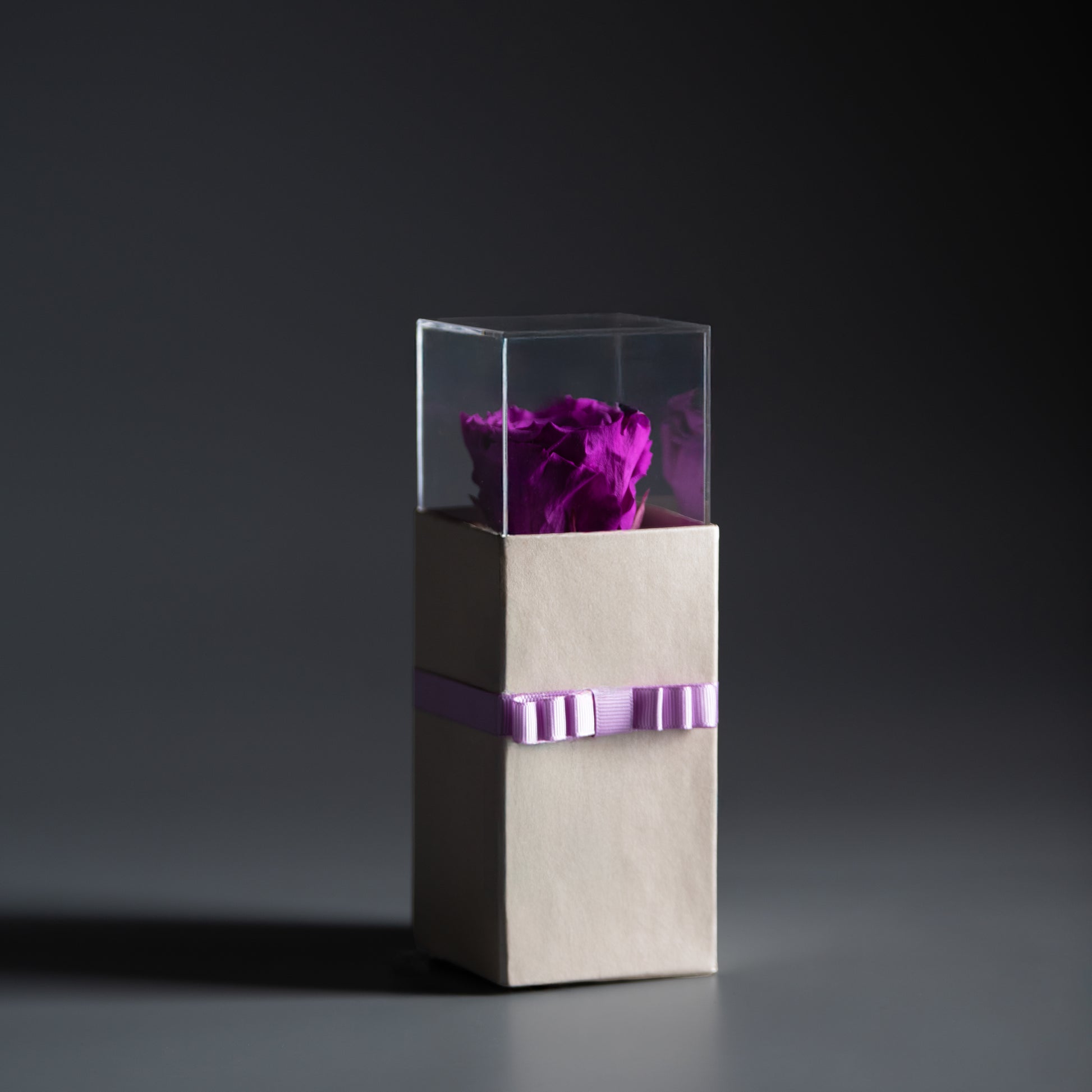 A preserved purple rose presented in a refined acrylic cube with soft neutral packaging and a lavender ribbon. Symbolizing admiration, creativity, and elegance.