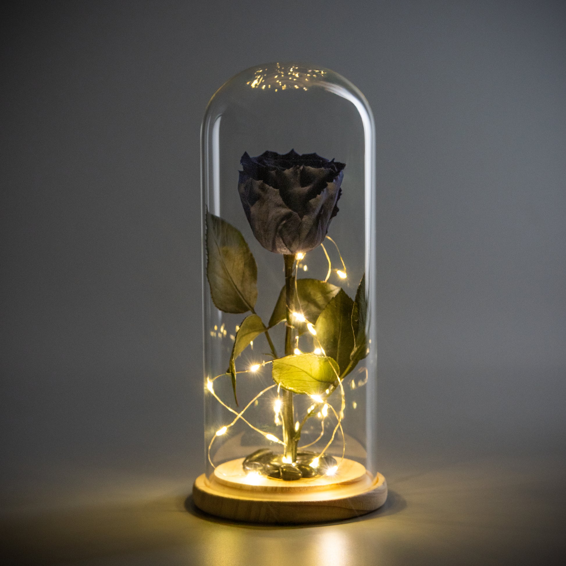 A preserved black rose illuminated by warm fairy lights beneath a crystal-clear glass dome. Mysterious and bold, this piece symbolizes eternal love with an edge of intrigue.